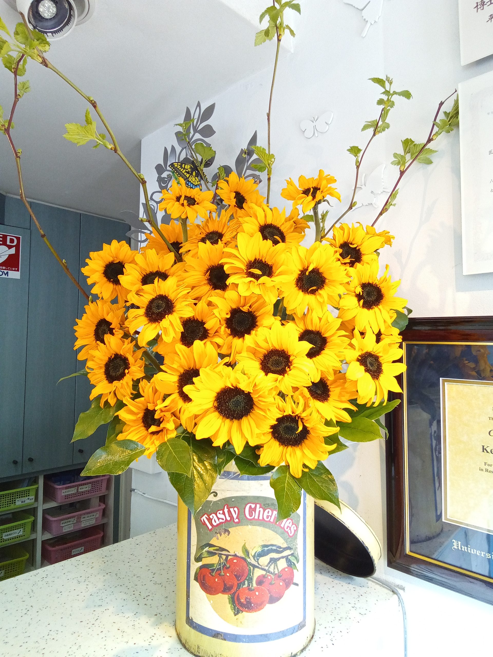 駒津歯科医院の受付カウンターに毎週ひまわりを活けています! 夏は診療所駐車場に大きなひまわりが育ちます。
