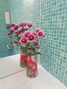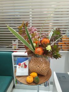 待合室→ピンクッション、カーネーション、キイチゴの葉