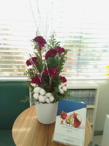 待合室→ケイトウ、ヒムロスギ、コットンフラワー、白枝