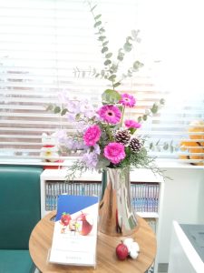 待合室→スイトピー、チューリップ、カーネーション、ユーカリ、松ぼっくり