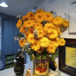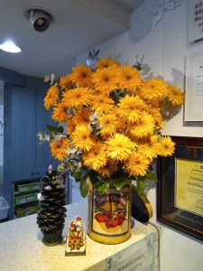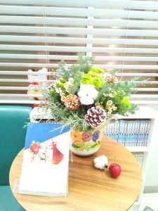 待合室→松ぼっくり、スプレーマム、ヒペリカム